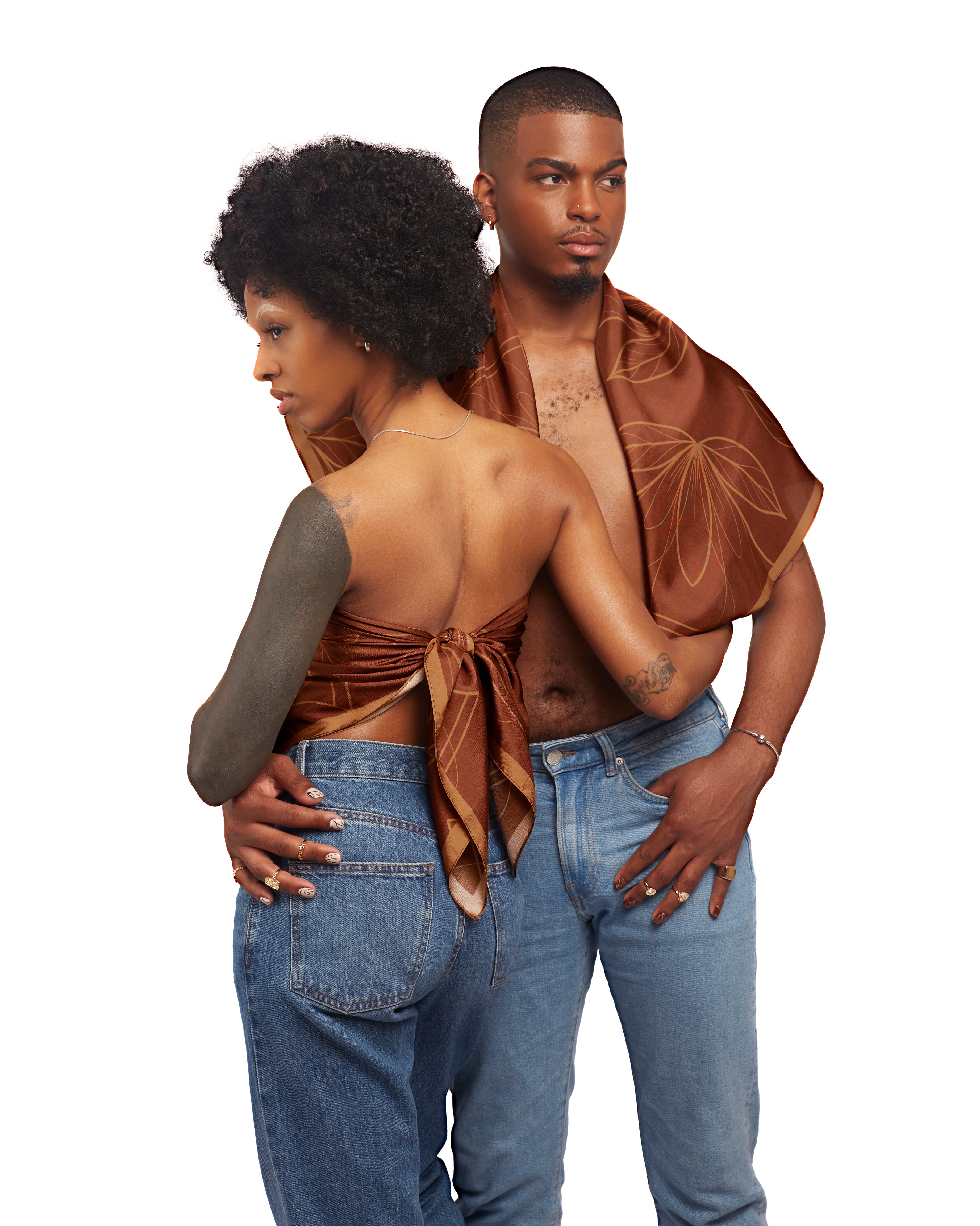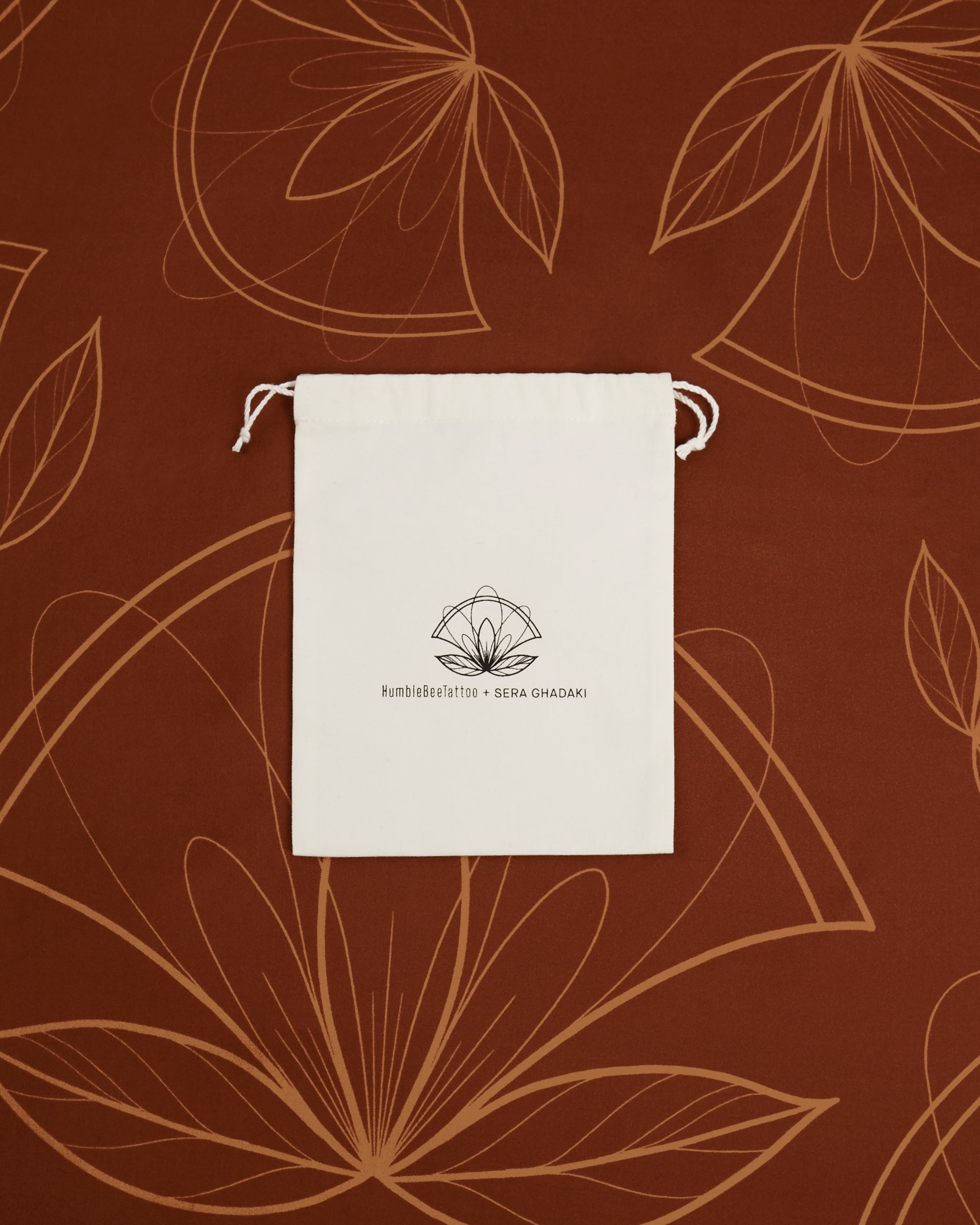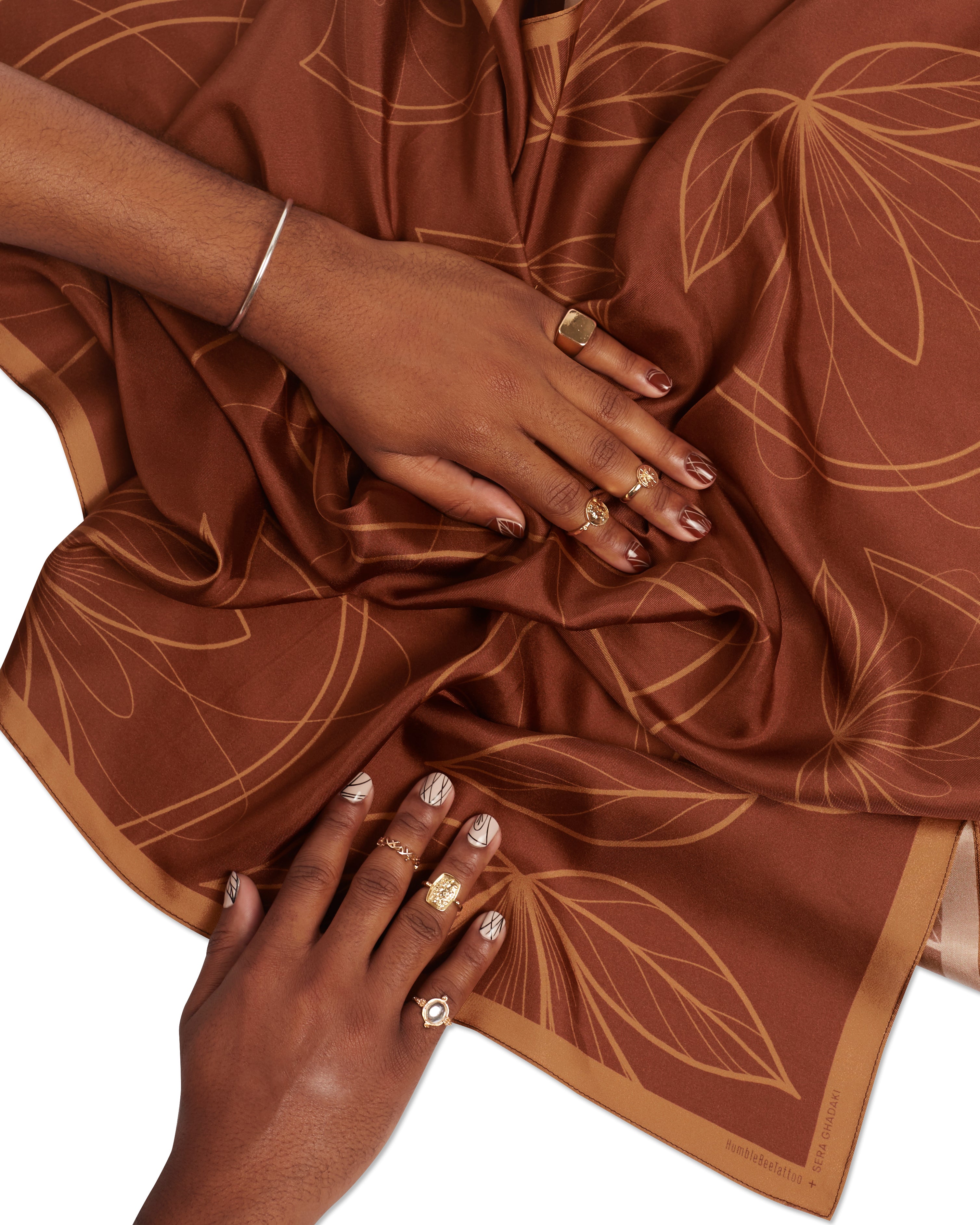 Limited edition silk scarf in collaboration with HumbleBeeTattoo and SERA GHADAKI. Digitally printed with an allover Egyptian lotus motif, this 36" square scarf can be worn in multiple ways around the head and body or displayed as a wall hanging. Available in bronze and gold or cream and charcoal. Digitally printed at a made-to-order, low-waste facility.
